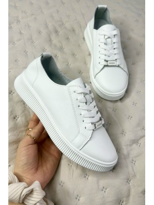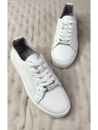 Poznaj białe, sznurowane trampki, osadzone na płaskiej podeszwie. Cholewka krótka, kończąca się przed kostką. Buty wykonane z wysokiej jakości skóry naturalnej. Basicowe trampki zachwycą wygodą i uniwersalnością.